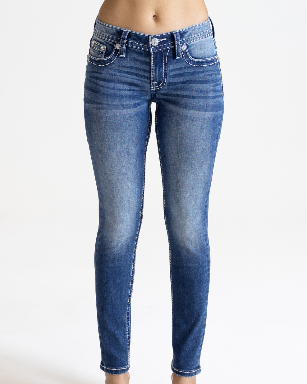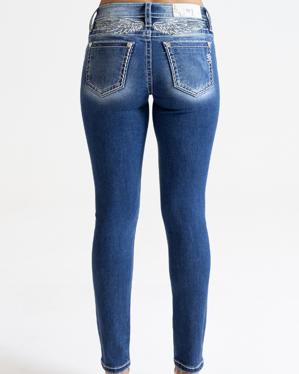Enhance your denim game with these mid-rise, medium wash skinny jeans. Featuring stunning silver embroidered wings with rhinestone studs on the yoke and silver and black saddle-stitching with rhinestone rivets on the classic back pocket design. The embossed white leather wing Miss Me brand patch adds a touch of luxury. Subtle fading with whisker patterns adds dimension to these 5-pocket jeans. Don't miss your chance to own these must-have jeans!