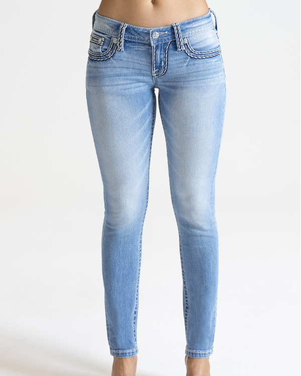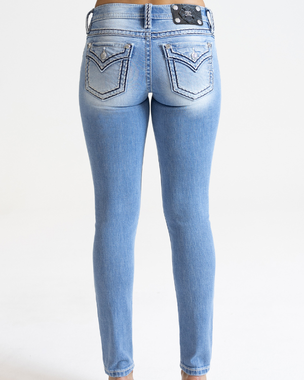 Indulge in the edgy yet classic style of Cleo Stitched with these low-rise, light-wash skinny jeans. Featuring a sleek black and white saddle-stitched border design, these jeans are adorned with an embroidered white Miss Me logo on the back pocket and an embossed black studded leather cross Miss Me logo brand patch. The fading and whiskering details add a touch of vintage charm, completing the look of these 5-pocket design jeans.