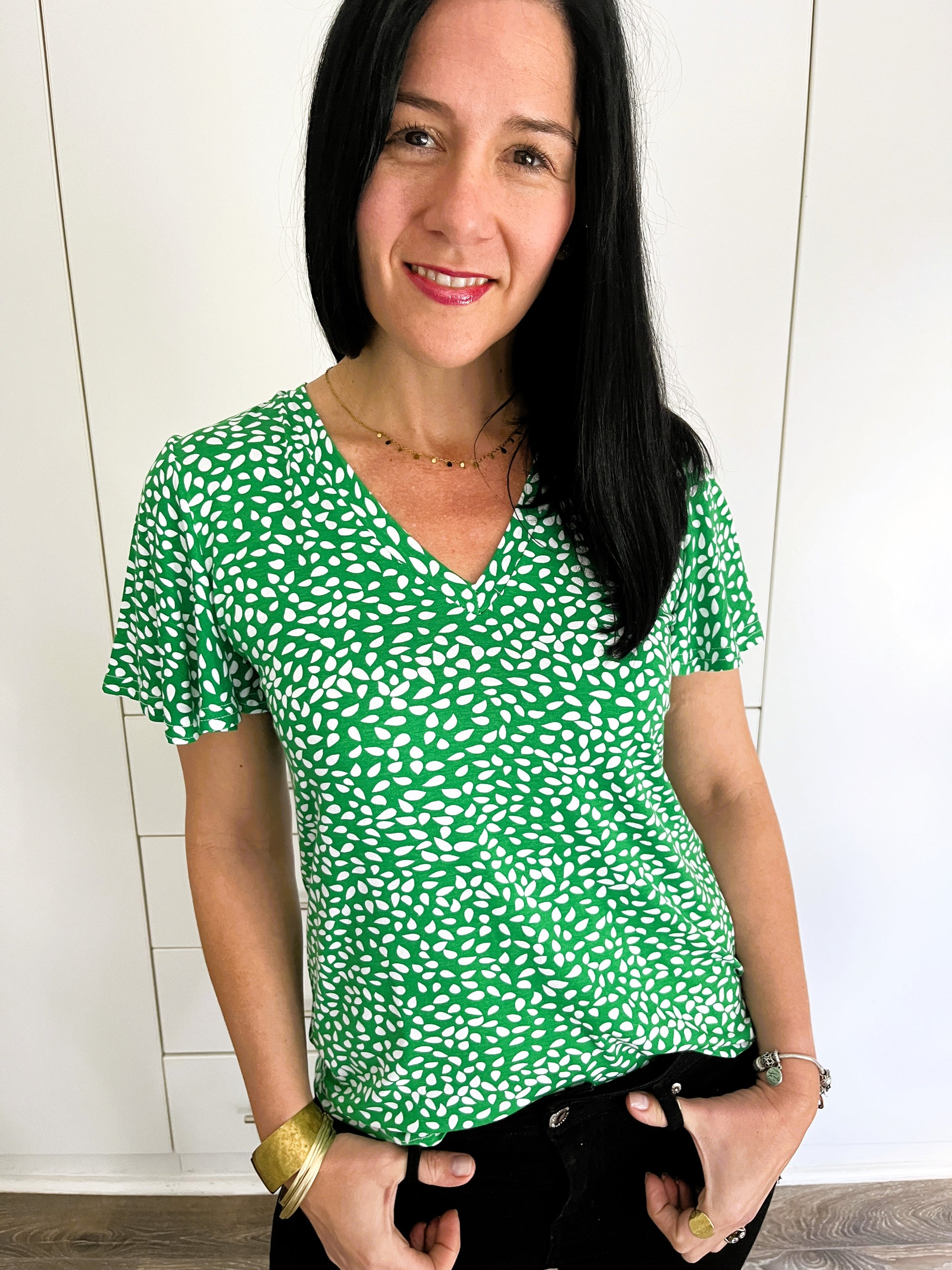 Make every day feel like a runway with our emerald green-and-white statement blouse – where timeless print meets playful charm. Featuring flirty frill sleeves and a flattering V-neckline, this piece effortlessly blends smart sophistication with casual chic.