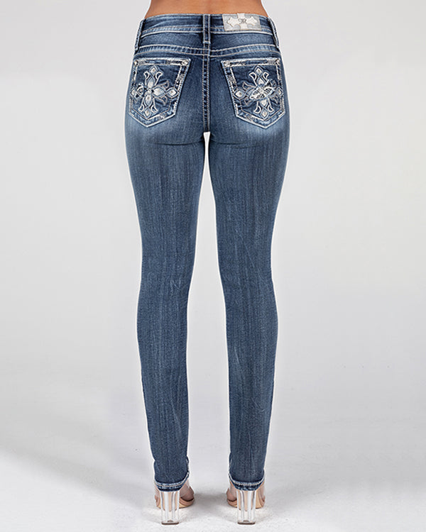 Embrace your fashion game with these stunning medium dark-wash skinny jeans adorned with intricate floral embroidery in refreshing blue and sparkling silver. The back pocket features a crafted design with a mix of mini rhinestones, silver sequins, and delicate pearls. The rhinestone rivets add a touch of glamour, while the embossed silver and white leather M logo brand patch adds a luxurious touch. These jeans boast a 5-pocket design and subtle fading for a stylish yet effortless look.