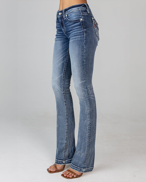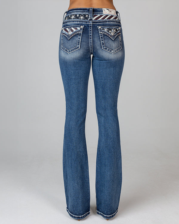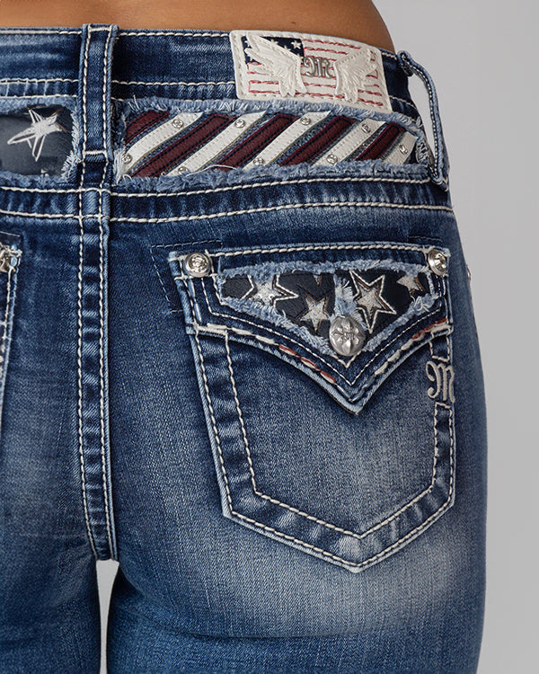 Boost your denim game with these mid-rise, medium dark wash bootcut jeans featuring unique leather stripes and cutout star inserts on the yoke and pocket flap. Silver star inserts and rhinestone rivets add a touch of glamour, while red, white, and blue stitching on the front and back pockets adds a patriotic touch. The 5-pocket design and light fading create a timeless, versatile look. Complete with a white leather brand patch adorned with embroidered americana and leather wings, these jeans are a must-have for any fashion-forward individual who is passionate about American pride.