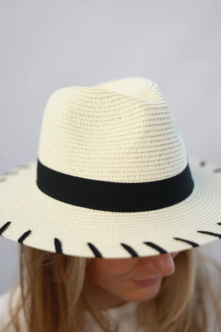 A modern classic with subtle detailing, The Rangerette Hat is designed for effortless everyday style. Crafted from finely woven straw in a soft cream tone, this structured fedora silhouette is finished with a sleek black band and distinctive hand-stitched detailing along the brim for a refined yet relaxed look.